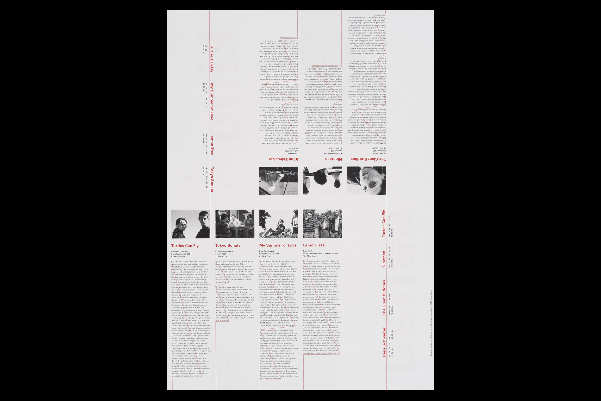 Gestaltung eines Monatsprogramms für das «Neue Kino» in Basel. Das Monatsprogramm funktioniert als Flyer und zugleich als Plakat. Die spielerische Linie, welche sich an den Enden der Textblöcke orientiert, bildet einen starken Kontrast zum Raster, in welchem der Text platziert ist. Das Gestaltungskonzept ist auf weitere Monate anwendbar.