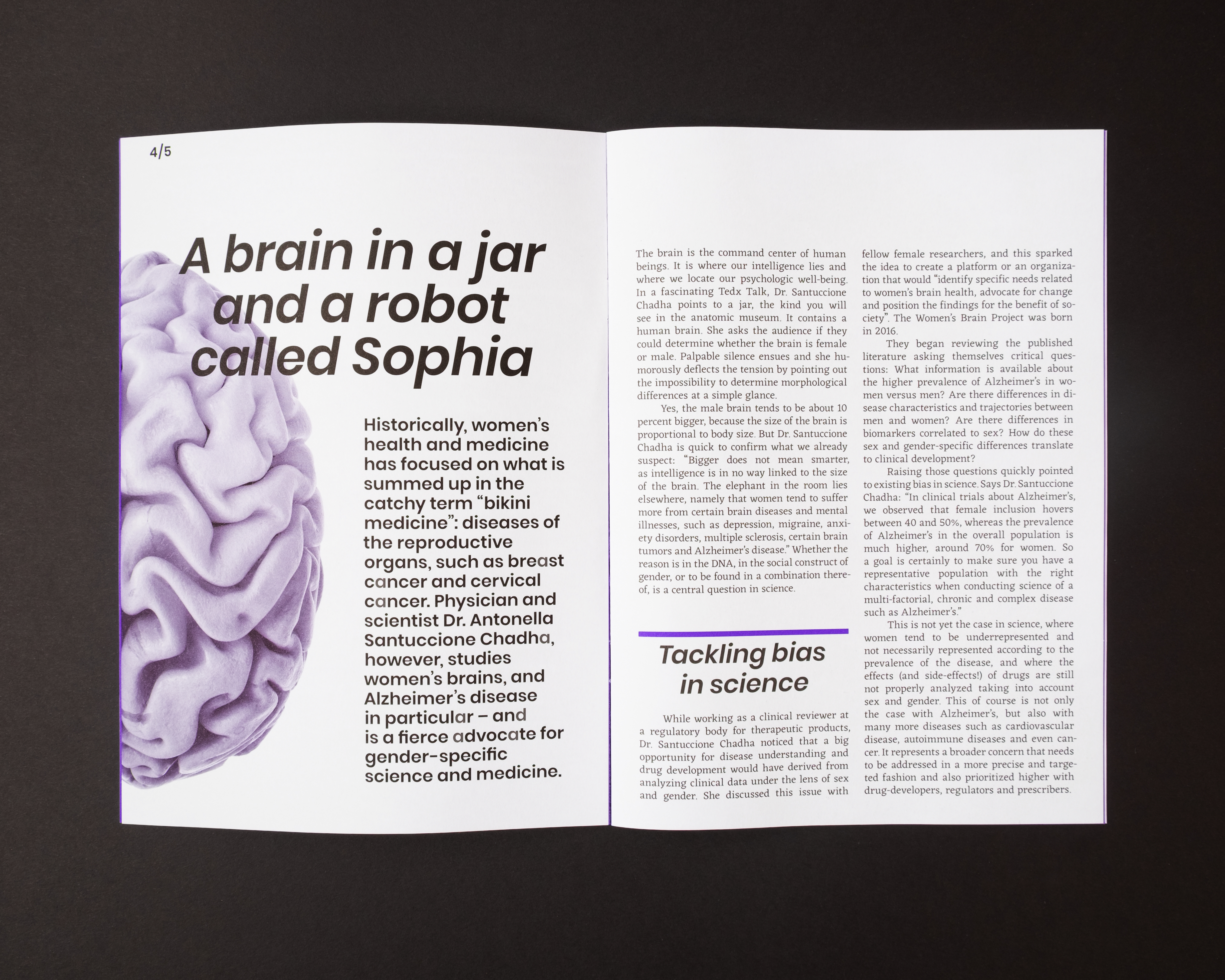 Gestaltungskonzept eines Booklets für die «Women’s Brain Project» Organisation. Zur Orientierung im Booklet und Markierung wichtiger Beiträge werden kleine Symbole gestaltet.